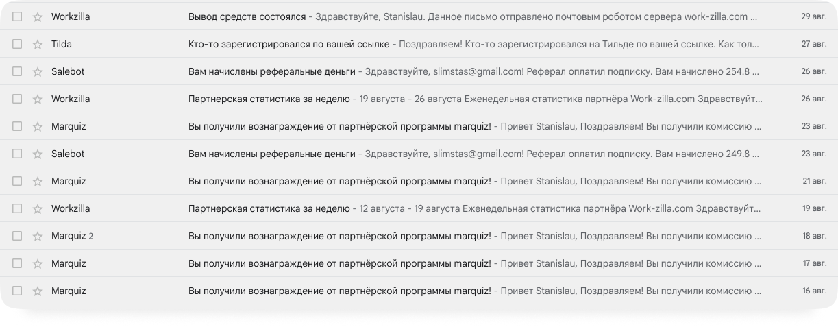 Всё что нужно сделать - это выполнить пару заказов, откинуться на спинку кресла и наблюдать как тебе приходят уведомления о начислении комиссий на твою карту. Это скрин из моей почты Gmail.