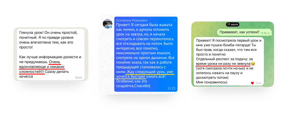 В курсе будет более 20 способов найти клиента. Ты получишь принципы общения и продажи в переписке. Я покажу свои примеры переписок и дам готовые речевые модули, которые сможешь вставлять клиентам в чат и закрывать их на сделку. И тебе не прийдется с ними созваниться или встречаться. Всё будет в рамках переписки в мессенджере.