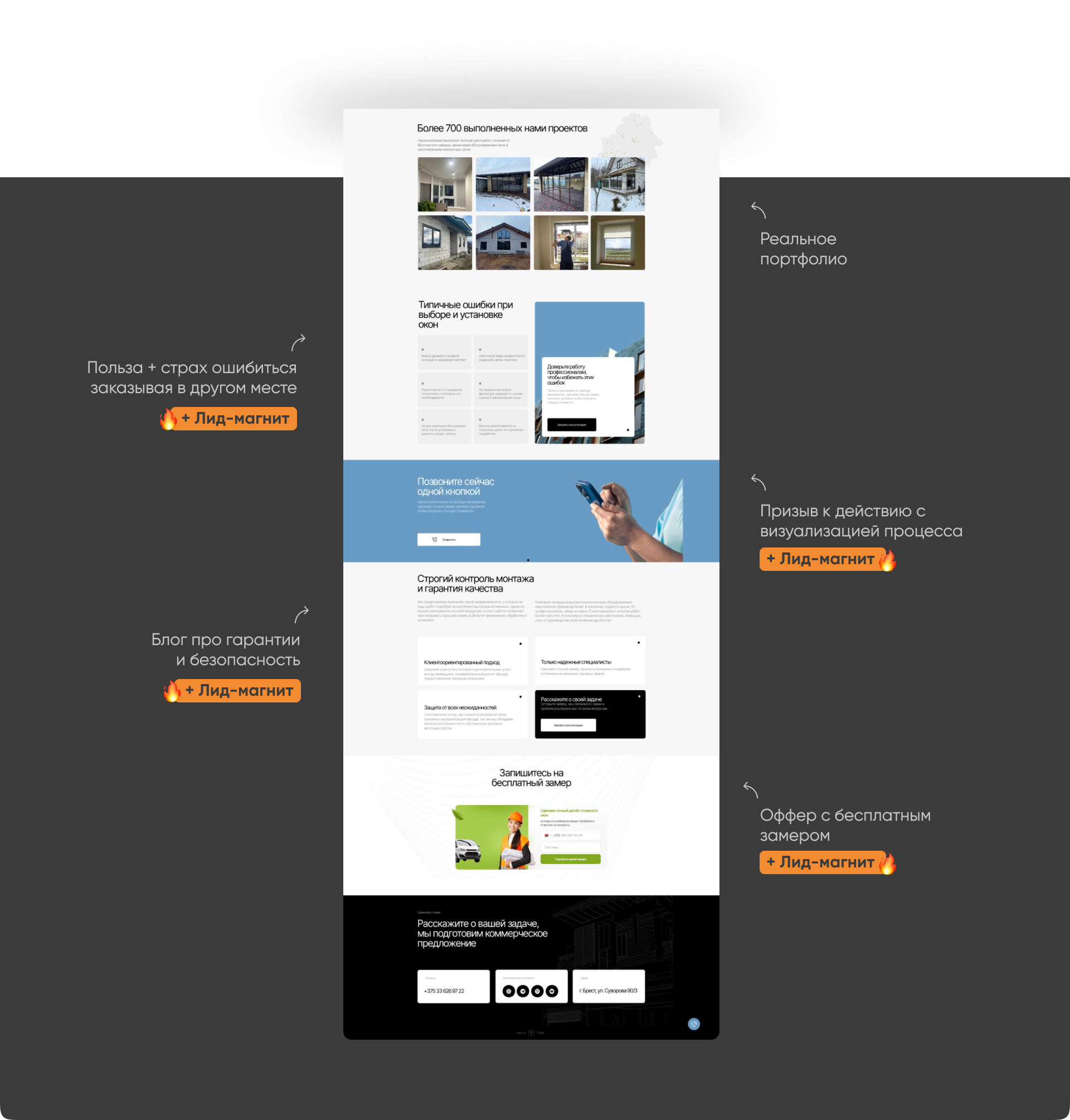 Сайт получился достаточно большим, аж на 12 блоков. Но, это оправдано. Покупка окон это достаточно дорогая покупка, а значит нужно быть уверенным на 100% кому доверить заказ.